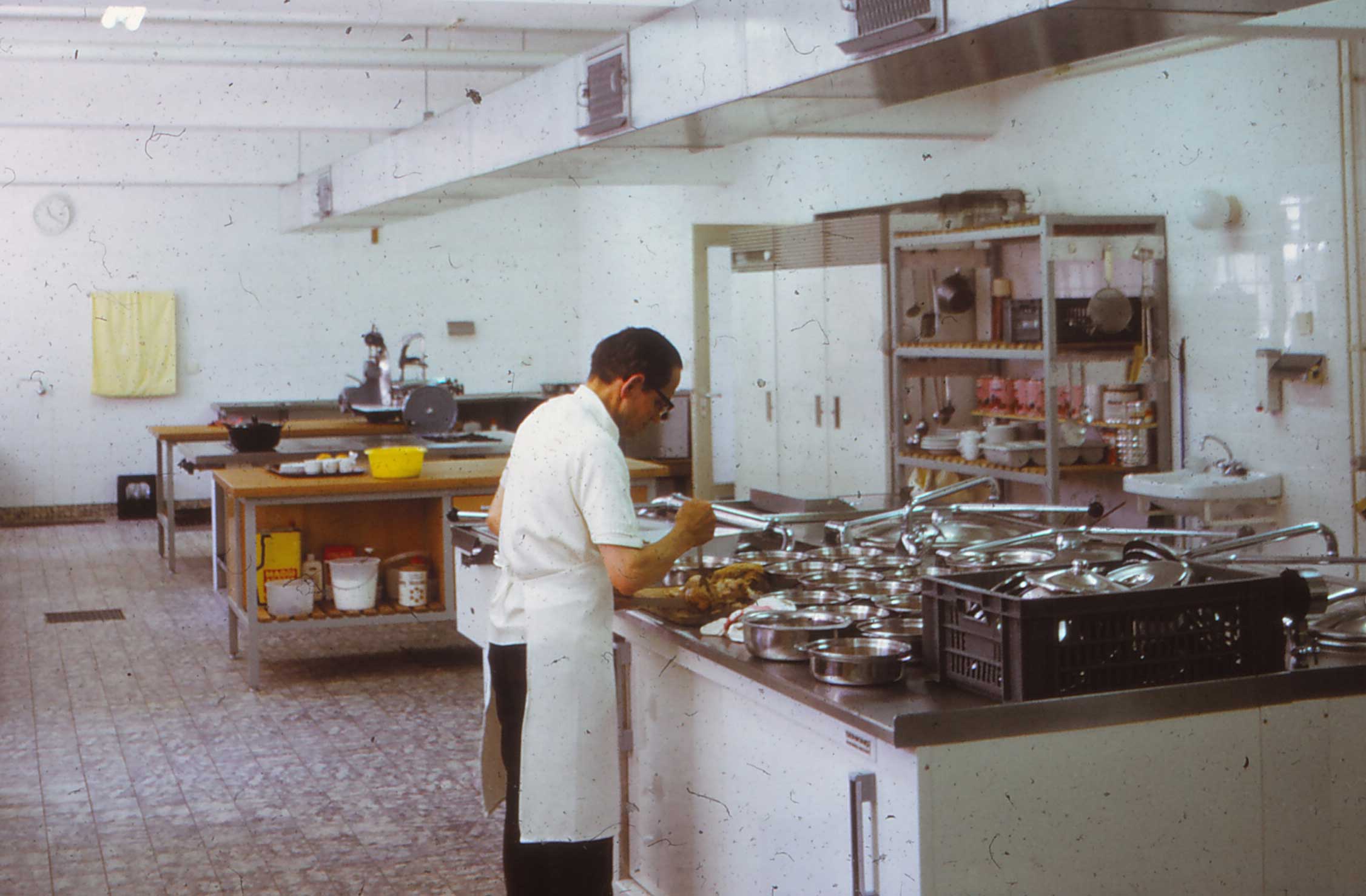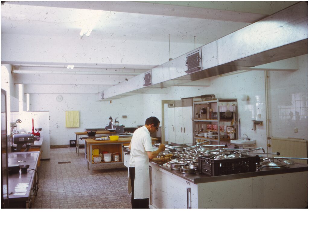 In die tijd was er een eetzaal waar één menu werd geserveerd voor de bejaarden uit het klooster en een gemeenschappelijke eetzaal voor de paters die rechts naast het klooster in bugalows woonden. Voor de nieuwbouw werd per persoon opgeschept in dekschalen en ging met warmwagens naar de appartementen. Ik kreeg wel te maken met veel diëten. De weekmenu’s maakte ik dikwijls thuis vanwege tijdsgebrek. Ook waren er soms kloosterfeesten, diners, buffetten en begrafenissen naast het reguliere werk. Gelukkig kreeg ik veel hulp van de zusters uit Etten in de vorm van afwassen of ondersteuning in de eetzaal.